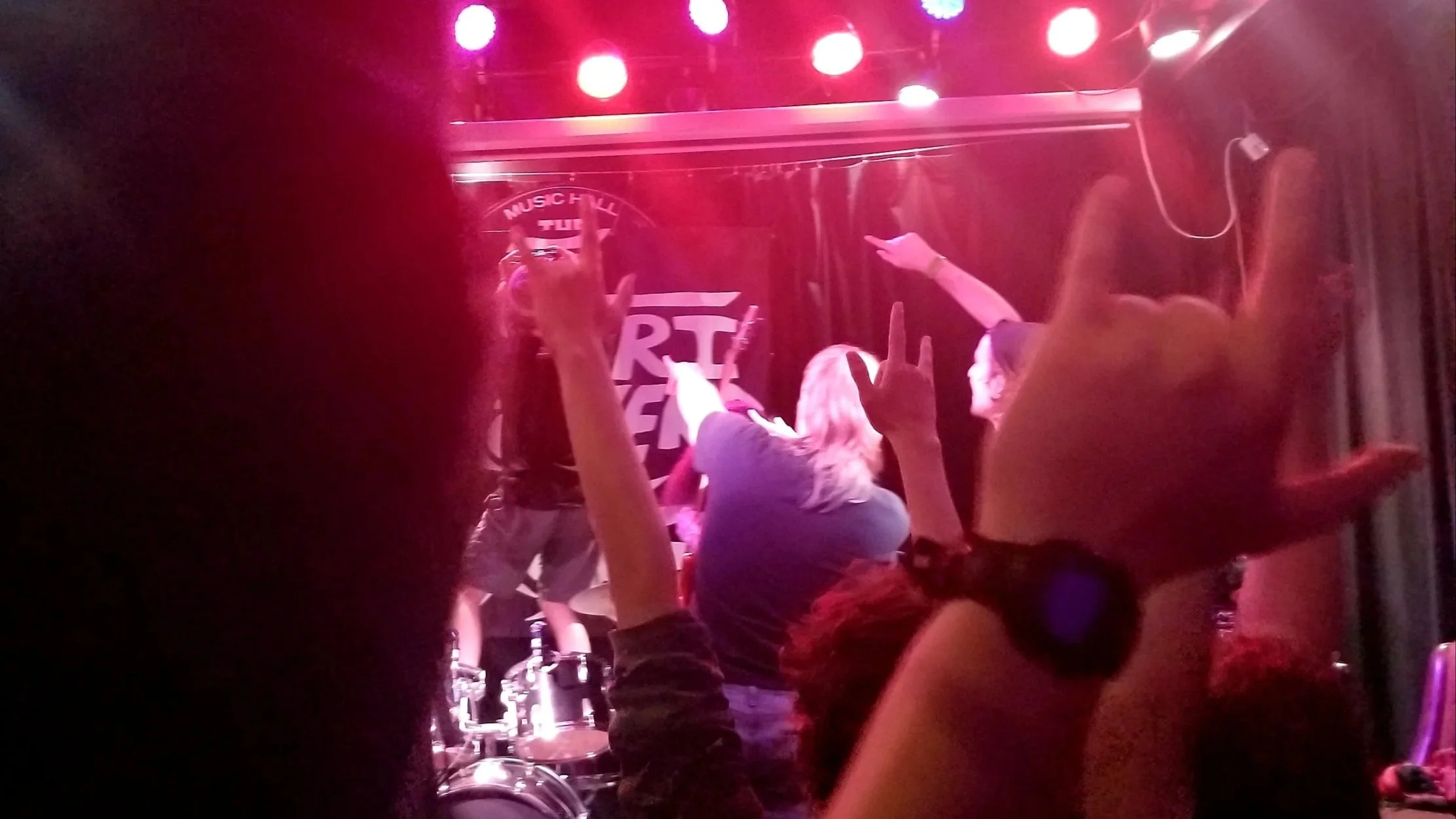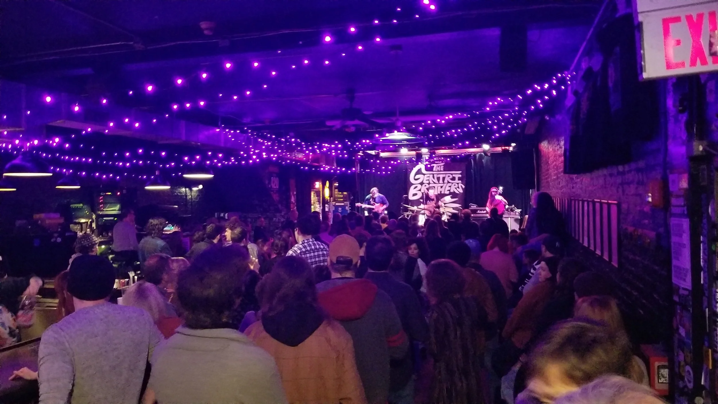 Band performing on stage at The Gengate Brothers music hall, with purple and red stage lights, black curtains, and audience members watching.